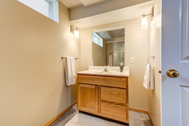 Remodeled bathrooms have marble counters and chrome fixtures.